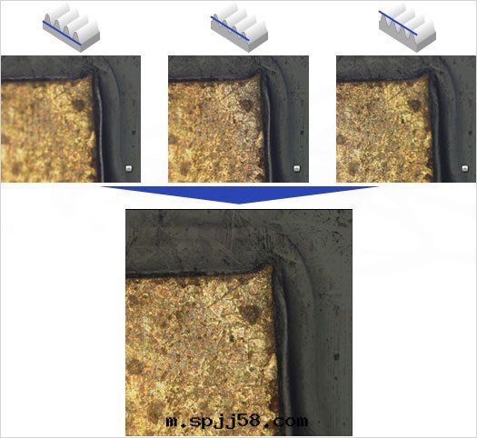 For example, even the most carefully polished sample may show unevenness where different materials meet. With conventional scopes at high magnification, such unevenness is out of focus and indistinct. DSX Series scopes move the focus to the higher portion of the sample and synthesize an image of the entire field that is perfectly in focus.
