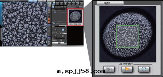 无論是(shì)提(tí)高(gāo)放大(dà)倍率縮小視场(chǎng)範圍,還(huán)是(shì)改變(biàn)觀察方(fāng)法(fǎ)進(jìn)行暗(àn)視场(chǎng)觀察,都不(bù)再会(huì)遺漏觀察位置。觀察过(guò)程中(zhōng)的(de)位置以(yǐ)明(míng)視场(chǎng)影像显示在(zài)"宏觀地(dì)图(tú)"上(shàng)。也(yě)可(kě)以(yǐ)将"全(quán)景功能"拼接的(de)影像显示在(zài)"宏觀地(dì)图(tú)"上(shàng)。